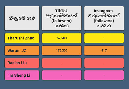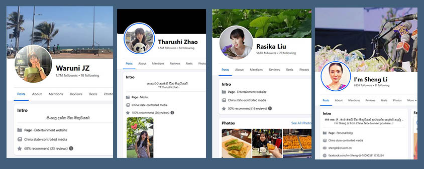 ආචාර්ය සංජන හත්තොටුව විසින් ඉකුත් ඔක්තෝබර් මස එළිදැක්වූ “Engineered authenticity: Chinese influence operations on Facebook in Sri Lanka” නම් අධ්යන වාර්තාවට අනුව Tharushi Zhao, Waruni JZ, Rasika Liu, I’m Sheng Li යන ෆේස්බුක් පුද්ගල ගිණුම් හතර සහ CGTN Sinhala Team, CGTN Sinhala යන ෆේස්බුක් පිටු දෙක සමස්තයක් ලෙස සමාජ මාධ්ය අනුගාමිකයන් මිලියන 6.1ක් වෙත පිවිසෙයි. එම ෆේස්බුක් පුද්ගල ගිණුම් හතර 2020 වසරේ අග භාගයේ දී ආරම්භ කර ඇති අතර මේ වනවිට “China State-Controlled Media” ලෙස ඒවා ෆේස්බුක් සමාගම විසින් ලේබල් කර ඇත. මෙම ගිණුම් අතරින් ගිණුම් දෙකකට මිලියනය ඉක්මවා ෆේස්බුක් අනුගාමිකයන් සංඛ්යාවක් සිටින අතර මෙරට සමාජ මාධ්ය බලපෑම්කරුවන් අතරින් එලෙස මිලියනය ඉක්මවූ ෆේස්බුක් අනුගාමිකයන් පිරිසක් සිටින්නේ කිහිප දෙනකුට පමණක් වීම විශේෂත්වයකි.