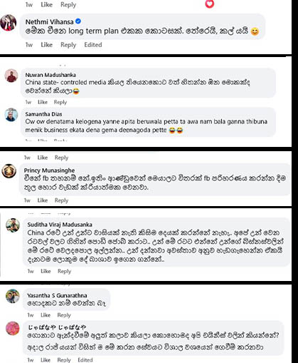 ”ඔවුන්ට තියෙනවා CGTN සිංහල කියලා වෙනම ප්රවෘත්ති අංශයක්. ඊට අමතරව ඔවුන්ට තියනවා ගිණුම් 4ක්. බැලූ බැල්මට ඒ අකවුන්ට් රෙජිස්ටර් වෙලා තියෙන්නේ ලස්සන චීන ගැහැණු කට්ටිය එක්ක. සිංහල හොඳට පුළුවන්. ඒ ගොල්ලෝ හරහා තමයි දෛනිකව චීනය ඉදිරිපත් කිරීමක් ලංකාවේ සෝෂල් මීඩියා ඕඩියන්ස් එකට දියත් කරන්නේ.