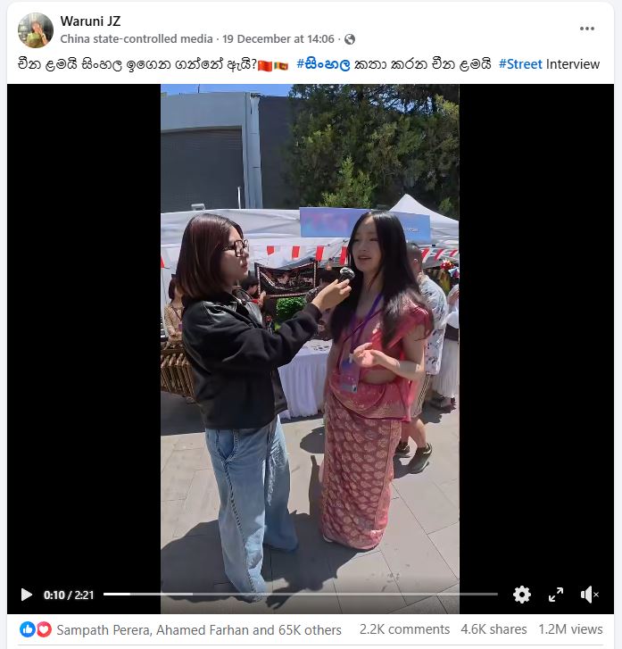 ෆේස්බුක් සමාජ මාධ්ය වේදිකාවේ මිලියන 1.2ක නැරඹුම් වාර ගණනක් සහිත වීඩියෝවක දැක්වෙන මෙම කතාබහ සිද්ධ වෙන්නේ චීන යුවතියන් දෙදෙනෙක් අතරයි. චීන උරුවක් ඇතිමුත් චතුර ලෙස සිංහල බස හසුරවන මේ යුවතියන් වෙත 65,000ක් දෙනකුගේ ප්රතිචාර, 2200 දෙනකු කොමෙන්ටු ද යොමු කර තිබූ අතර 4600 දෙනකු එම වීඩියෝව බෙදා ගෙන තිබුණි. විශේෂත්වය වන්නේ මෙසේ ප්රතිචාර දක්වා ඇති බහුතරයක් ශ්රී ලාංකික සමාජ මාධ්ය පරිශීලකයන් වීමයි. ඇතැමෙක් ආදර යෝජනා ද, තවත් අයෙක් සිංහල බස කතා කිරීම ගැන සුබ පැතුම් ද, මෙරට සම්ප්රදායික ඇඟලුමක් වන උඩරට ඔසරියක් ඇඳගෙන සිටීම වර්ණනා කිරීම් ද කොමෙන්ටු ලෙස පළ කර තිබුණි.