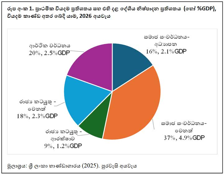 එම පනතේ ප්‍රතිඵලයක් ලෙස  ඔබ සහ මම 2026 සඳහා ගෙවන බදු සහ රජයට ලැබෙන අනෙකුත් ප්‍රදාන තුළින් රජයට  දළ දේශීය නිෂ්පාදිතයෙන් 15.4% ක් වන බිලියන 5,305 ක ආදායමක් උපයා ගත හැකි නමුත් රජයට වියදම් කළ හැක්කේ දළ දේශීය නිෂ්පාදිතයෙන් 13% ක් හෙවත් රු: ට්‍රිලියන 4,850 ක් පමණි. ඉතිරි බිලියන 820 ක ප්‍රාථමික ශේෂය  අපගේ අතීත පවු ගෙවීම සංකේත කරන ණය පොලී ගෙවීම් සඳහා වෙන් කෙරෙනවා (වගු අංක 1).