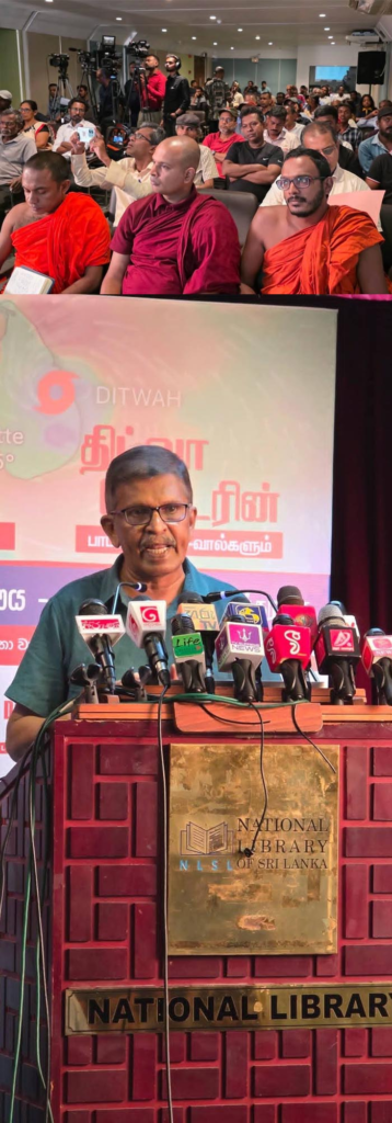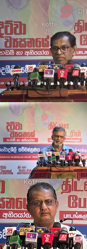 ජනතා වෘත්තික මධ්‍යස්ථානය විසින් සංවිධානය කරන ලද ‘දිට්වා ව්‍යසනයේ පාඩම් හා අභියෝග’ සංවාදශීලි සම්මන්ත්‍රණයෙදී  හිටපු කාලගුණ විද්‍යා අධ්‍යක්ෂ ජනරාල් සරත් ප්‍රේමලාල්, හිටපු භූ විද්‍යා සමීක්ෂණ හා පතල් අධ්‍යක්ෂ ජනරාල් මහාචාර්ය කිත්සිරි දිසානායක, හිටපු වාරිමාර්ග අධ්‍යක්ෂ ජනරාල් ඉන්ජිනේරු භද්‍රා කමලදාස, වෛද්‍ය ගිශාන්ත දසනායක අදහස් දැක්විය.
