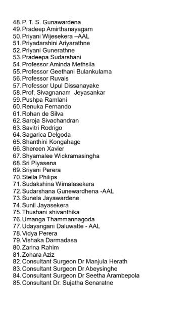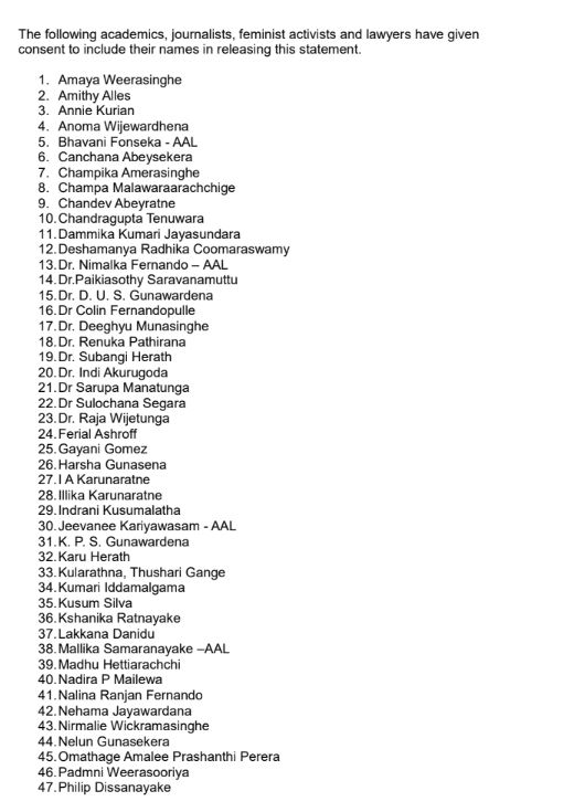 මෙම ප්‍රකාශයට දේශමාන්‍ය රාධිකා කුමාරස්වාමී, ආචාර්ය නිමල්කා ප්‍රනාන්දු, ආචාර්ය සුභාංගී හේරත්, ආචාර්ය රේණුකා පතිරණ, ජී.යු.එස්. ගුණවර්ධන, දීගු මුණසිංහ, කාන්තා ක්‍රියාකාරී පුෂ්පා රම්ලිනි රත්නායක, සරෝජා ශ්‍රිවචන්ද්‍රන්, ශ්‍රී සෙරීන් සේවියර්, විශාකා ධර්මදාස. විද්‍යා පෙරේරා, නිර්මලී වික්‍රමසිංහ, සාවිත්‍රි රෝඩ්‍ර්ගු, ශ්‍රීයානා පෙරේරා, උදයංගනී දළුවත්ත, ජීවනී කාරියවසම්, කුමුදුනී සැමුවෙල්, සරීනා රහීම්, සුහාරා අසීස් සහ හිටපු පාර්ලිමේන්තු මන්ත්‍රී ෆෙරියල් අශ්රොෆ් ඇතුළු 50කට අධික පිරිසක් අත්සන් තබා ඇත.