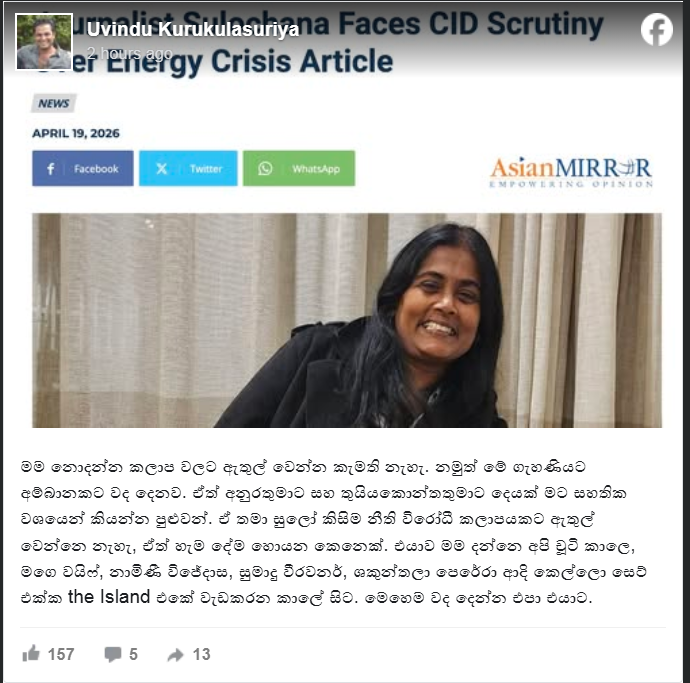”ලබාගත් තොරතුරු අනුව, ඇයගේ ගිණුමට සම්බන්ධ ලිපියක් ශ්‍රී ලංකා නීති උල්ලංඝනය කරන බව පවසමින් CID විසින් නීතිමය ඉල්ලීමක් ඉදිරිපත් කර ඇති බව X සමාගමෙන් ඇයට දැනුම් දී ඇත. එමඟින්, මෙම අන්තර්ගතයට එරෙහිව මේ වනවිට කිසිදු ක්‍රියාමාර්ගයක් ගෙන නොමැති බවද සඳහන් කර ඇත.